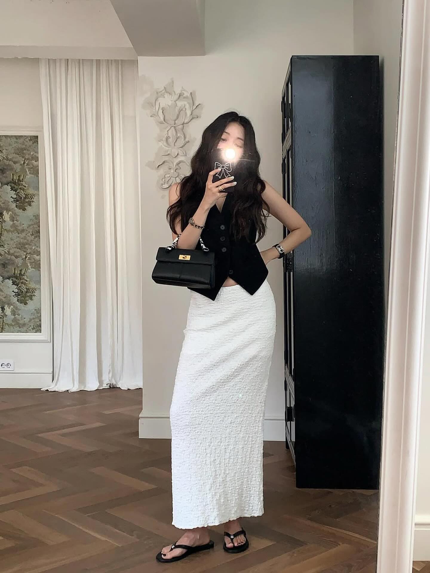 Bạn có thể kết hợp chân váy đen với áo sơ mi trắng để tạo nên phong cách công sở chuẩn mực, hoặc mix cùng áo len mỏng khi thời tiết se lạnh để mang lại cảm giác mềm mại hơn. Một đôi giày cao gót hoặc giày bệt tối giản sẽ hoàn thiện vẻ ngoài mà không cần quá nhiều phụ kiện. Điểm mạnh của chân váy đen là sự linh hoạt, phù hợp từ môi trường làm việc đến những buổi gặp gỡ nhẹ nhàng.
