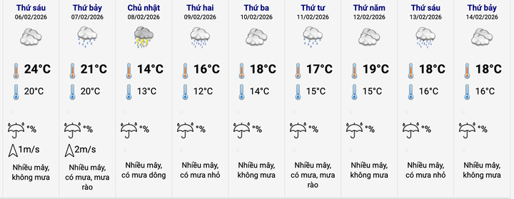 Cụ thể, ngày 6/2, thời tiết khu vực này không có nhiều biến động so với những ngày trước đó, trời nhiều mây, không mưa, nhiệt độ cao nhất 24°C, thấp nhất 20°C.