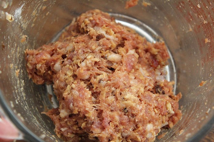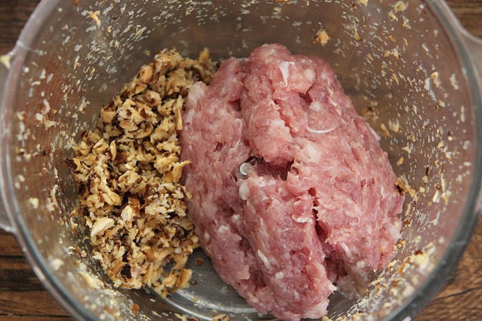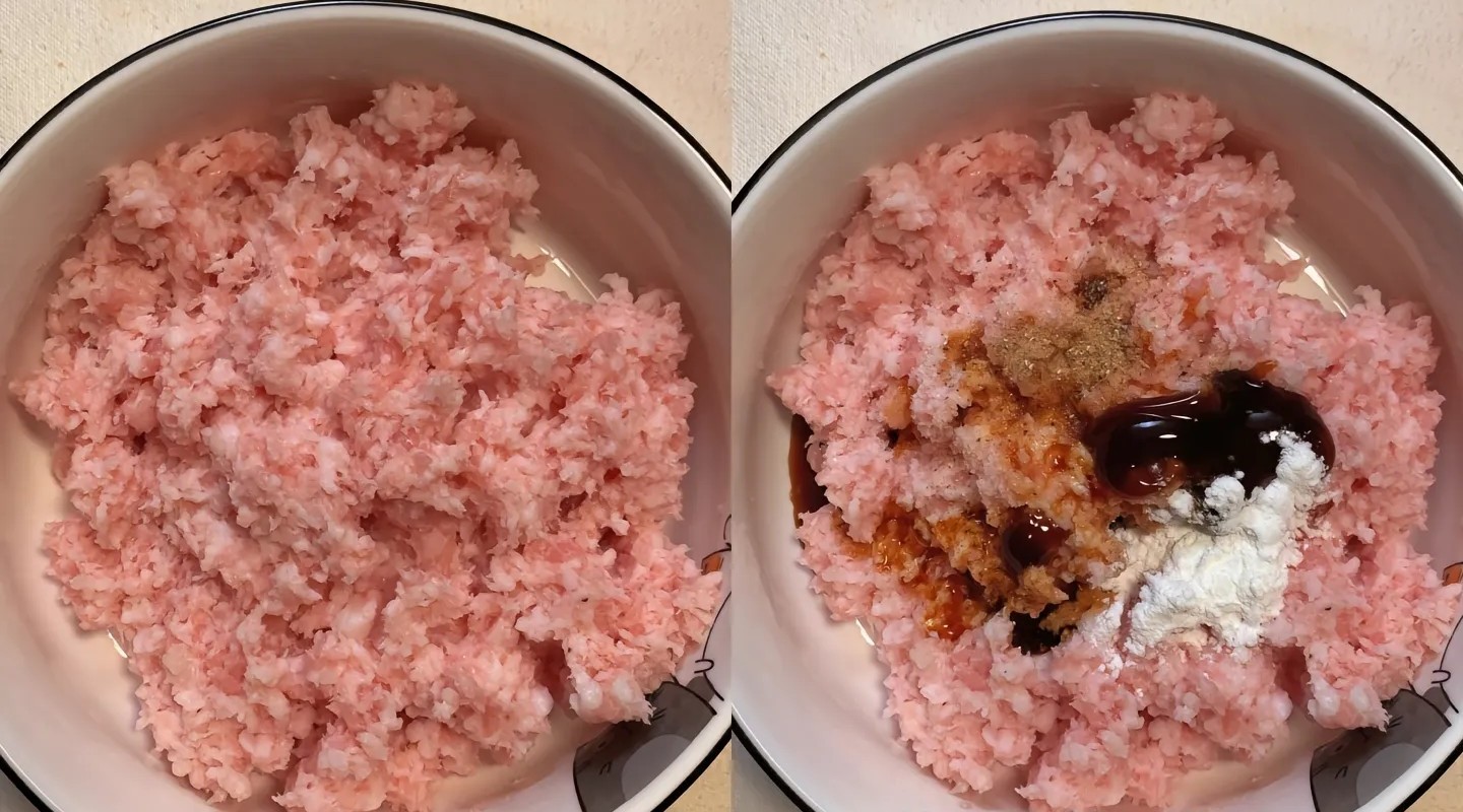 Bước 2: Cho nấm hương và thịt băm vào bát tô, sau đó thêm 1 thìa canh nước tương, 1 thìa canh dầu hào, dầu mè và một ít bột bắp vào. Dùng đũa khuấy đều theo chiều kim đồng hồ một lúc cho đến khi các nguyên liệu quyện dẻo.