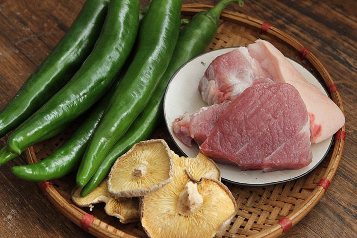 Nguyên liệu chính: 7-8 quả ớt sừng xanh to đều nhau, 5-6 cây nấm hương, 250g thịt nạc vai, 1 thìa canh nước tương, một chút muối, lượng dầu mè vừa phải, một ít bột bắp.