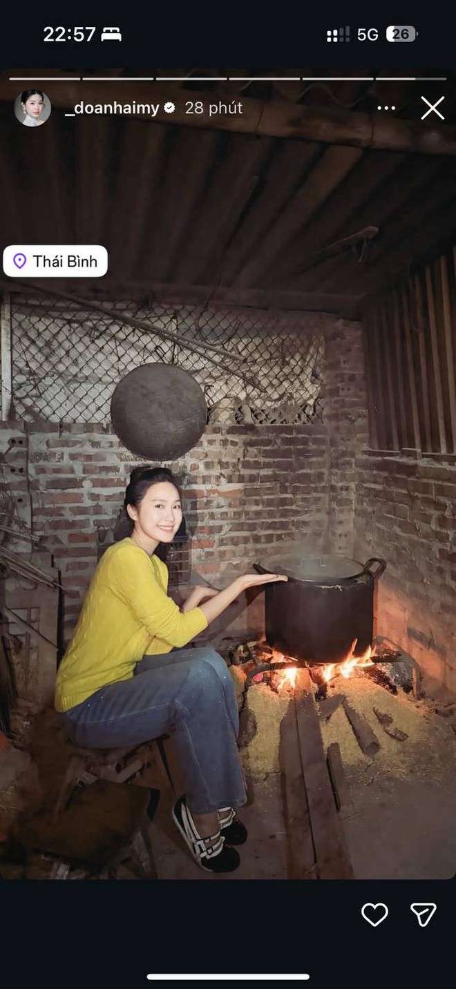 Trên trang cá nhân, Doãn Hải My gây chú ý khi đăng tải hình ảnh về quê ăn Tết cùng gia đình chồng - hậu vệ Đoàn Văn Hậu. Doãn Hải My diện đồ xinh xắn, ngồi bên bếp củi canh nồi bánh chưng. Khung cảnh đúng chuẩn Tết truyền thống: bếp lửa đỏ rực, nồi bánh nghi ngút khói, không khí ấm cúng sum vầy.