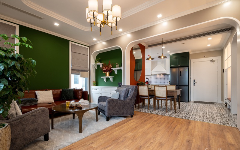 Căn hộ được kiến trúc sư kết hợp 2 màu xanh lá và cam đất tưởng chừng như không ăn nhập nhưng lại mang đến sự thu hút bất ngờ.