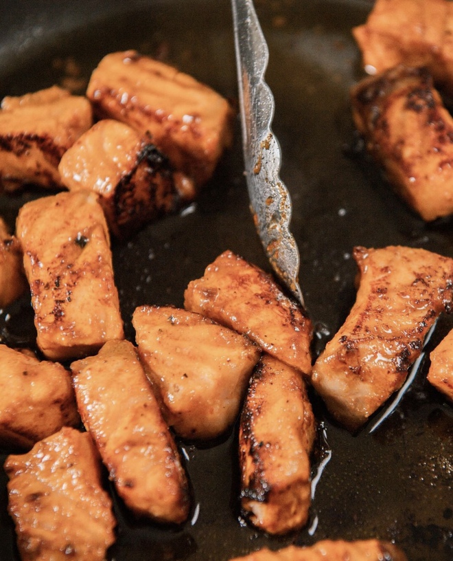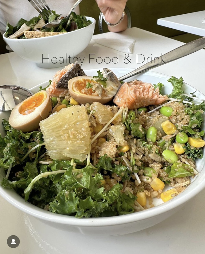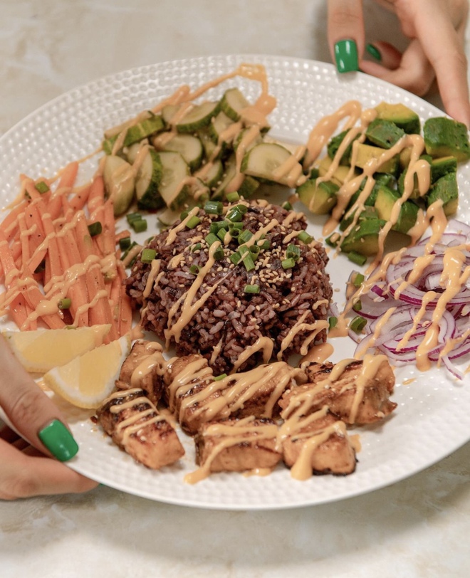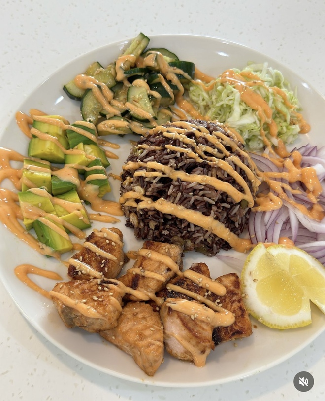 Salmon bowl là một món được Kỳ Duyên làm đi làm lại, có lẽ đây cũng là món mà cô cực kỳ yêu thích. Từ cá hồi, các loại rau củ quả như bơ, dưa chuột, hành tây... cùng cơm gạo lứt, tất cả hoà quyện tạo nên món ăn thơm ngon và phần hình ảnh lẫn hương vị...