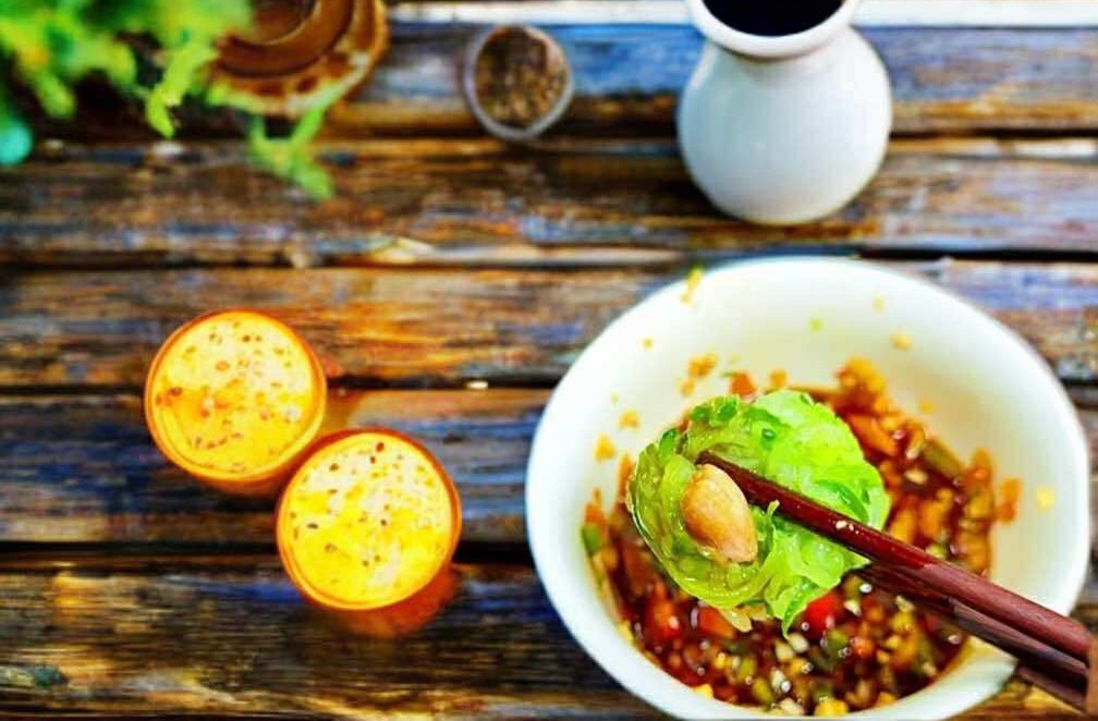 Nguyên liệu: 1 củ cải xanh, 2 thìa canh bột năng, lượng đậu phộng vừa phải, một chút muối, nước tương, một ít tỏi băm, đường, giấm.