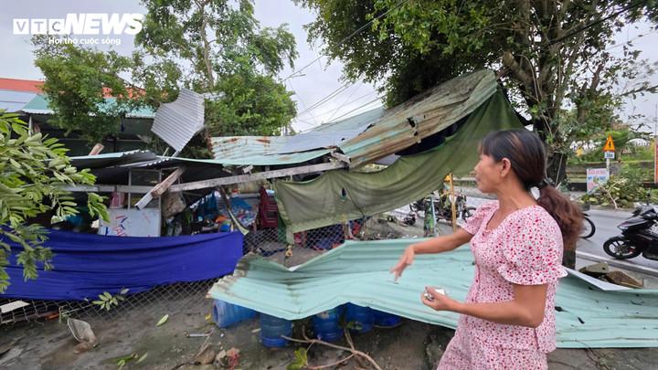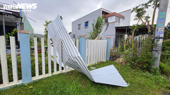 Mái tôn bị gió cuốn phăng, nằm biến dạng vào bờ rào.