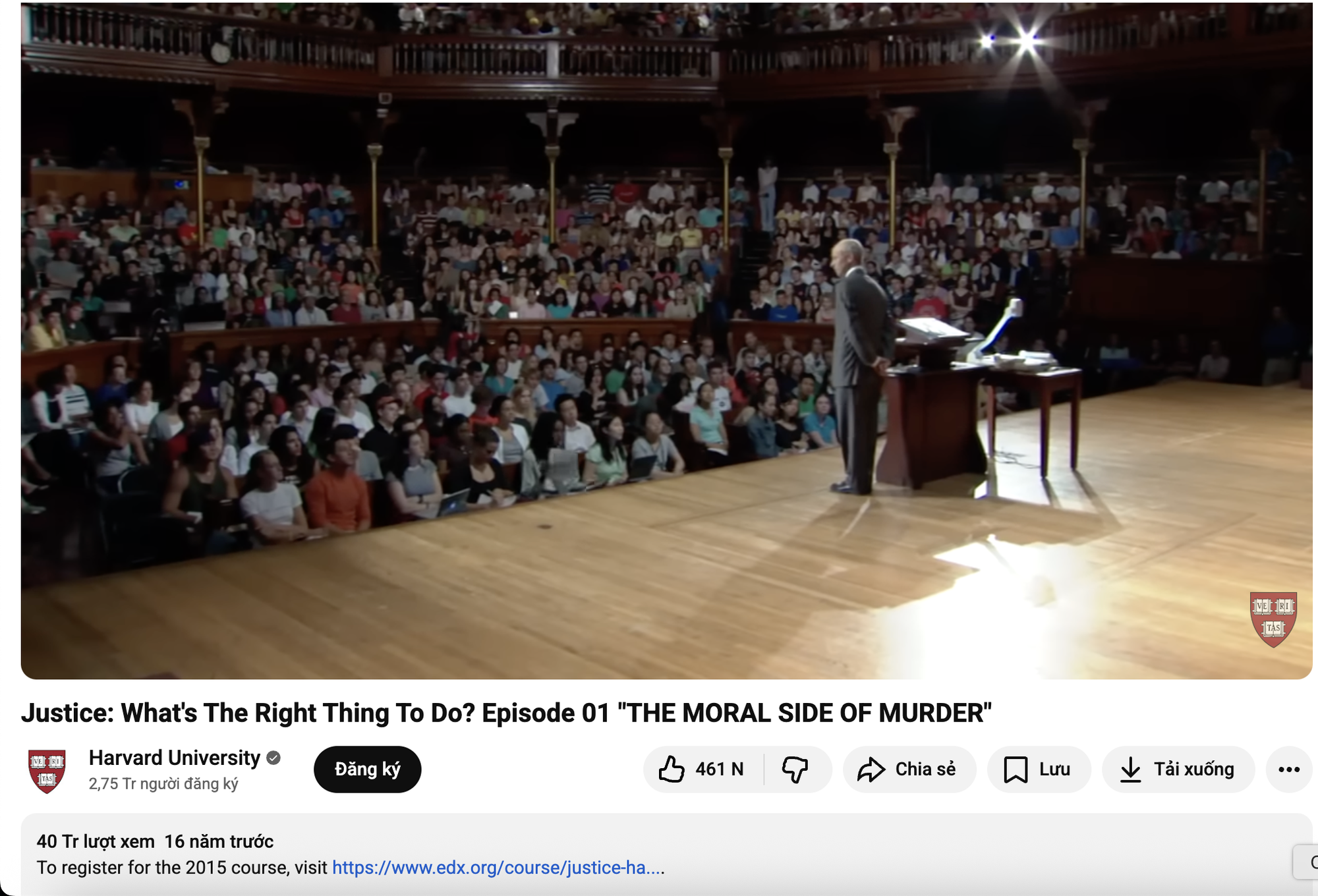 Chỉ tính riêng trên kênh YouTube "Harvard University", bài học mở màn của khoá học Justice đã hút 40 triệu view (Ảnh chụp màn hình)