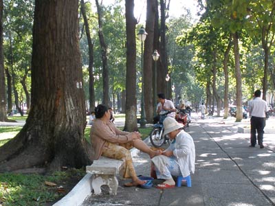 Đúng như tâm tình của chị M., đảo qua một số chợ như chợ Bến Thành, chợ Phạm Văn Hai, chợ Kim Biên… vào giữa trưa, đâu đâu chúng tôi cũng bắt gặp cảnh chị em tiểu thương thư giãn, làm đẹp bằng việc giũa móng.