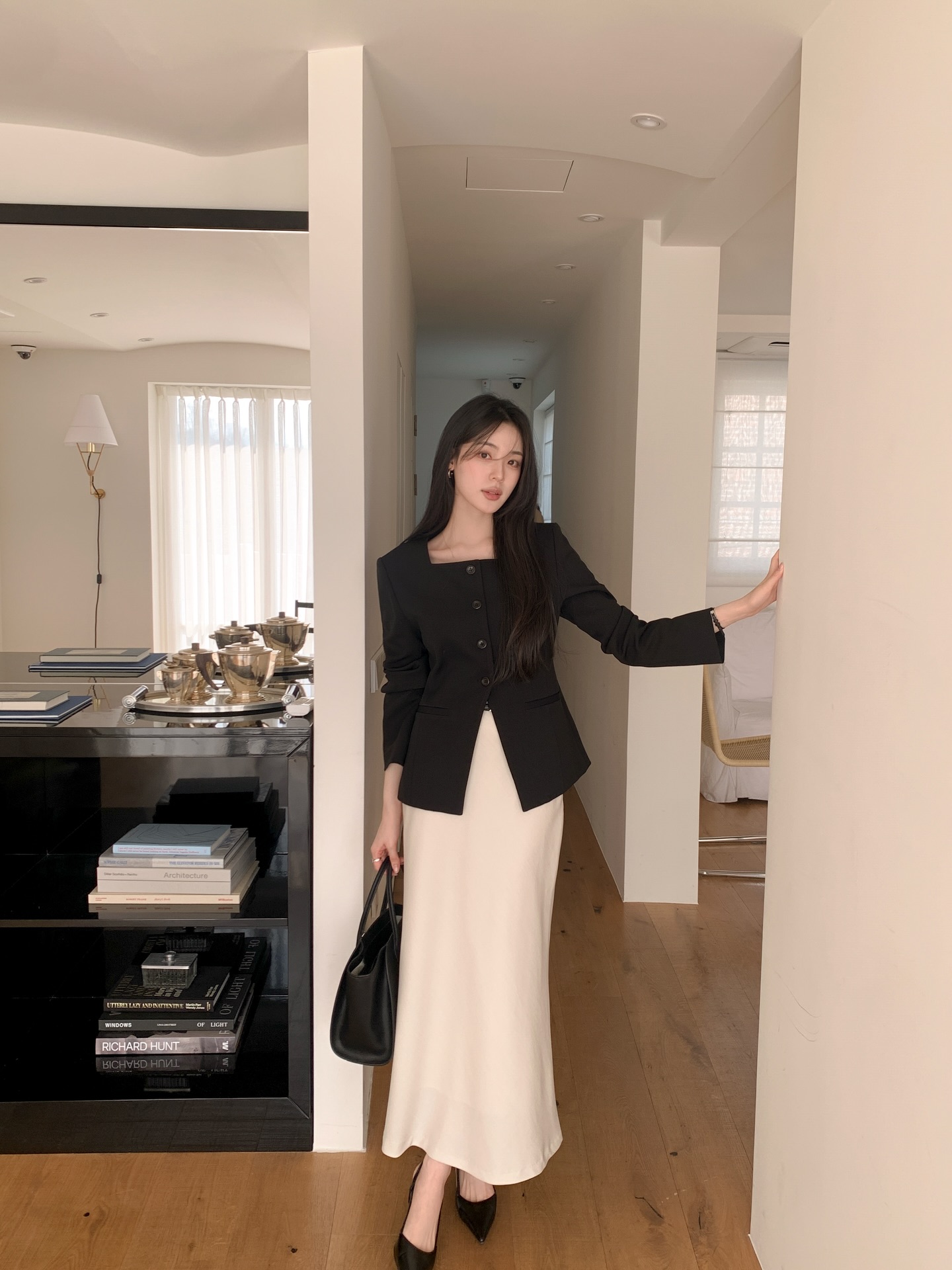 Gam màu trung tính như be, xám, xanh navy hoặc đen thường được ưu tiên vì tạo độ tương phản vừa phải với chân váy trắng. Khi sơ vin gọn gàng, set đồ mang lại cảm giác cao ráo và chuyên nghiệp, rất phù hợp cho môi trường công sở. Có thể hoàn thiện trang phục bằng một đôi giày cao gót mũi nhọn hoặc sandal quai mảnh để tăng nét thanh lịch.