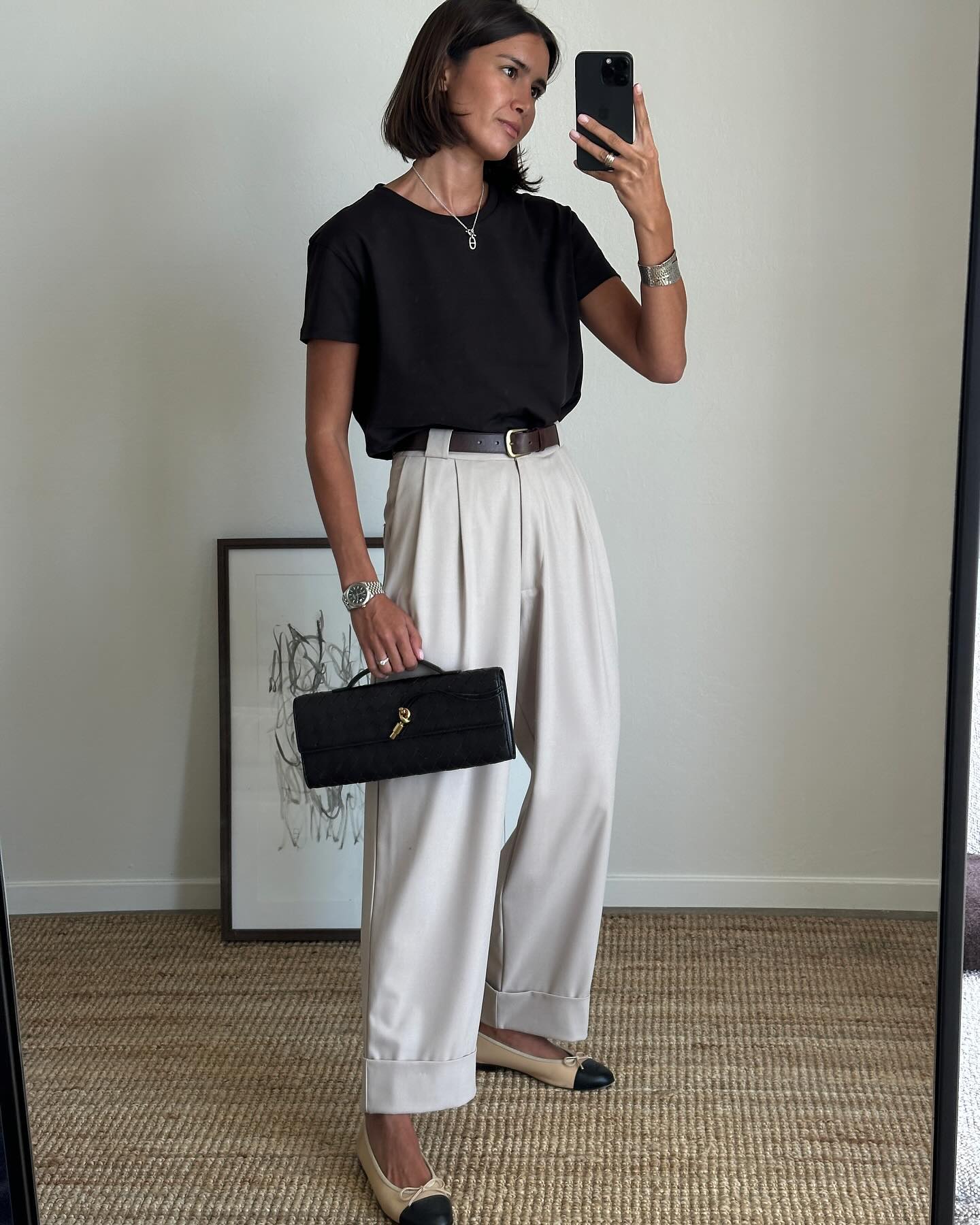 Phụ kiện đi kèm thường rất tiết chế: một chiếc thắt lưng nhỏ, đôi khuyên tai đơn giản hoặc đồng hồ cổ điển. Nhờ đó, bộ trang phục giữ được sự thanh lịch mà không bị rối mắt.
