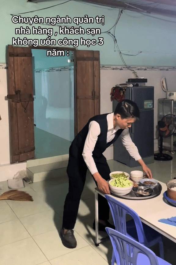 Mặc gile đen bưng mâm cơm "chuẩn 5 sao" giữa gian nhà quê, thanh niên khiến người xem đòi kiểm tra bảng điểm