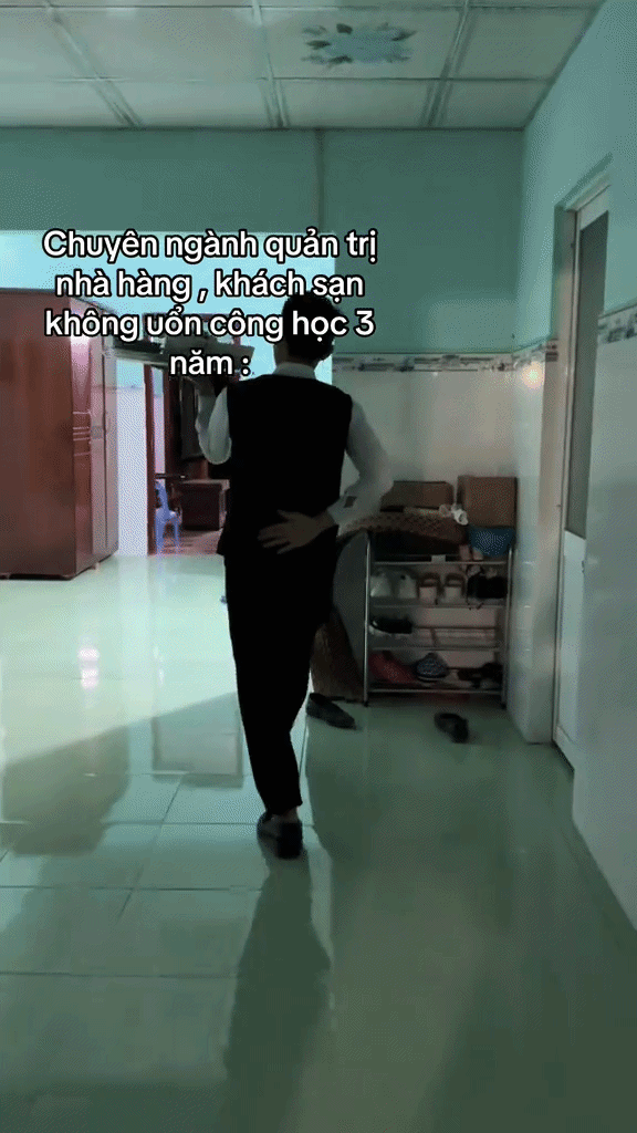 Thay vì dùng hai tay để bê mâm cơm đầy ắp các món ăn như thông thường, thanh niên này lại nhẹ nhàng nhấc bổng cả mâm bằng một tay. Khi di chuyển, bước đi của anh chàng vô cùng tự tin, uyển chuyển, một tay còn lại được đặt gọn gàng sau lưng, tạo nên một phong thái chuyên nghiệp không khác gì một nhân viên phục vụ tại các nhà hàng, khách sạn sang trọng. Màn trình diễn này không chỉ khiến người thân trong gia đình đứng hình mà còn làm cho cư dân mạng được một phen trầm trồ.