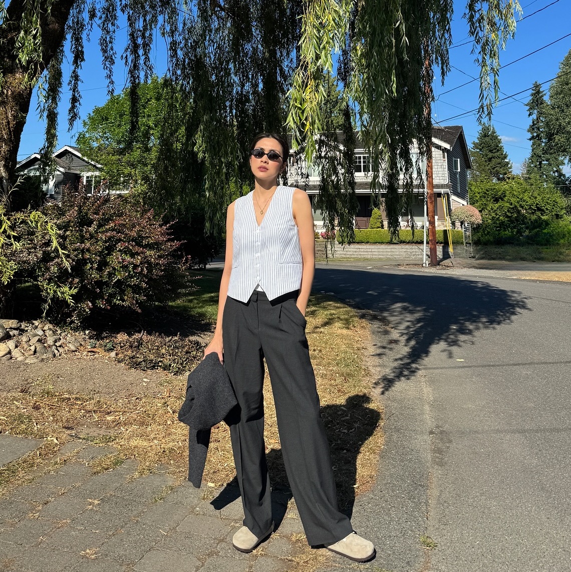 Áo gile vẫn rất chuẩn mốt và trở thành điểm nhấn thú vị khi kết hợp cùng quần ống rộng. Bộ đôi này mang hơi hướng cổ điển pha lẫn hiện đại, tạo nên vẻ ngoài có chiều sâu và đầy phong cách.