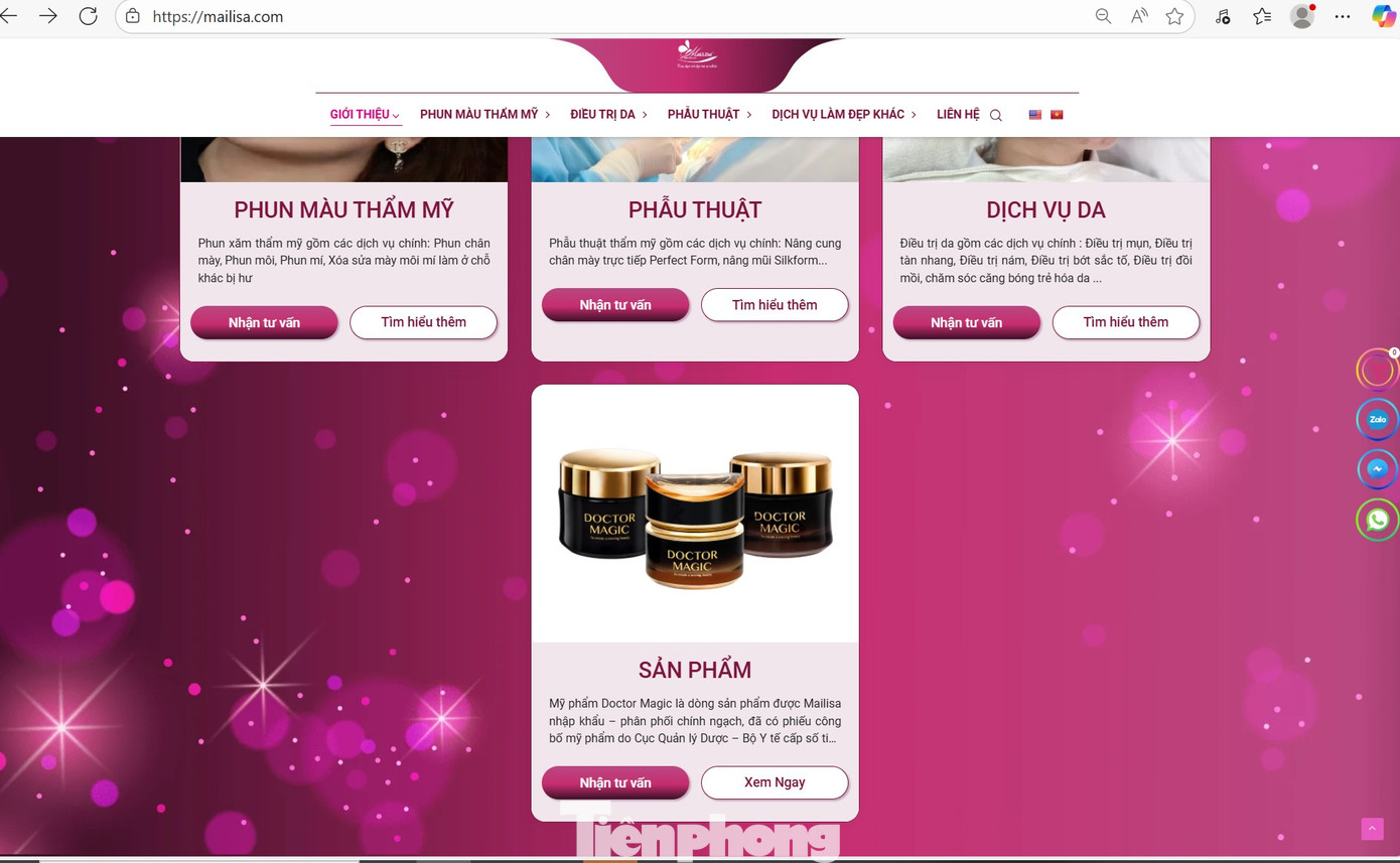 Khi kéo xuống phía dưới, mục "sản phẩm" vẫn hiển thị hình ảnh và thông tin sản phẩm Mỹ phẩm Doctor Magic đồng thời có dòng giới thiệu: "Mỹ phẩm Doctor Magic được Mailisa nhập khẩu - phân phối chính ngạch, đã có phiếu công bố mỹ phẩm do Cục Quản lý Dược - Bộ Y tế cấp số...".