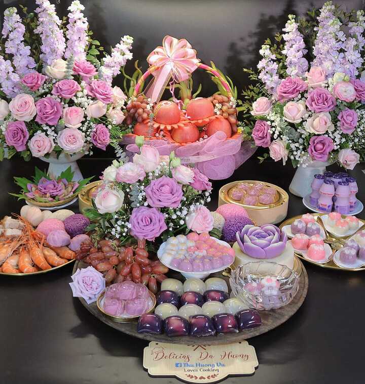 Mâm lễ cúng Tết Hàn thực với màu sắc bắt mắt.