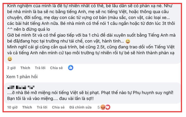 Giữa luồng thảo luận, một phụ huynh bất ngờ đưa ra "kinh nghiệm": "Ở nhà, cứ thấy con nói tiếng Việt thì phạt. Bạn tôi từng vả vào miệng con vài lần, sợ quá nên chỉ dám nói tiếng Anh thôi".