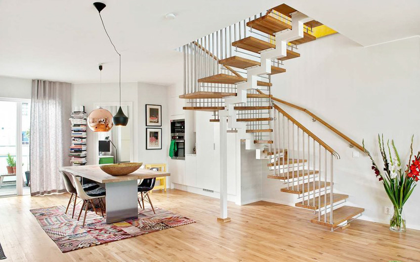 Cầu thang gỗ được thiết kế khá ấn tượng với những thanh gỗ kết nối với lan can inox chắc chắn. Cầu thang là nút giao thông chính để kết nối hai căn hộ ở hai tầng khác nhau tạo thành tổ ấm rộng rãi và xinh xắn.