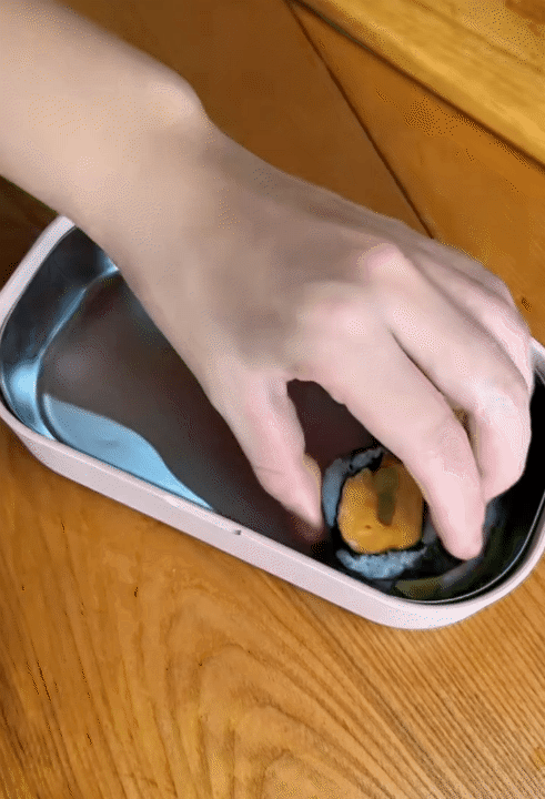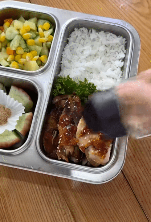 Mỗi hộp cơm chị Hà chuẩn bị đều đầy đủ bốn nhóm chất: cơm, rau, thịt hoặc cá, thêm một chút hoa quả tráng miệng. Điều đặc biệt là thực đơn của các bé hiếm khi bị lặp lại. Hôm nay có thể là cơm chiên trứng cuộn, mai lại đổi sang bò mỹ cuộn cơm, hôm sau nữa là cá sốt cà hay gà chiên mắm... Chính sự thay đổi này khiến các con luôn háo hức mỗi khi mở hộp cơm của mẹ.