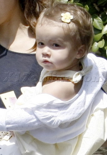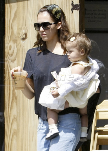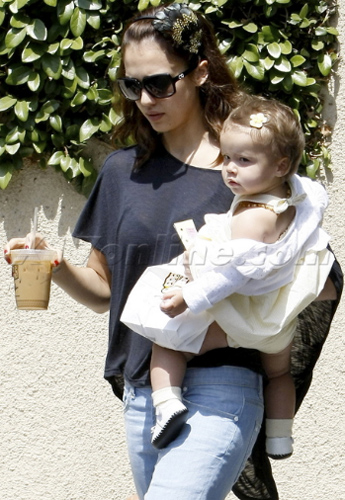 Hai mẹ con Jessica Alba ghé quán mua một cốc cà phê, cô bé con được mẹ cho mặc áo và đeo nơ rất đáng yêu.