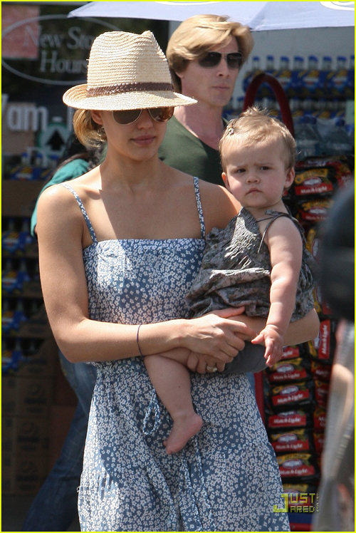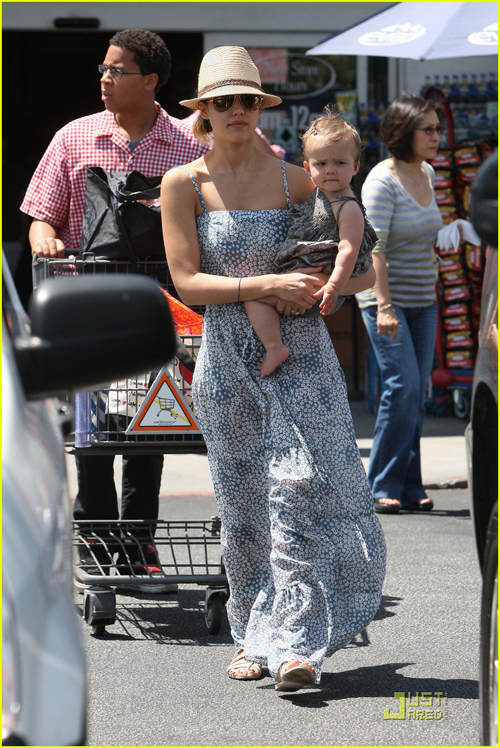 Jessica Alba bế con gái Honor đến cửa hiệu tạp hóa, hai mẹ con mặc váy hoa rất xinh và điệu.