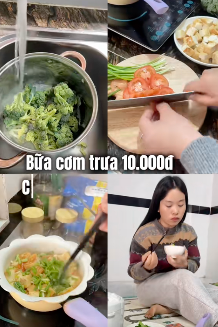 Có hôm khác, bữa trưa của mẹ đơn thân chỉ khoảng 10k. Một bìa đậu giá 10k được chia làm hai bữa, tính ra mỗi bữa chỉ khoảng 5k tiền đậu. Cô mua thêm súp lơ với giá 5k một cây, nhưng chỉ ăn một nửa cho bữa trưa vì một cây khá to, tính ra chỉ 2,5k tiền rau cho bữa trưa.
