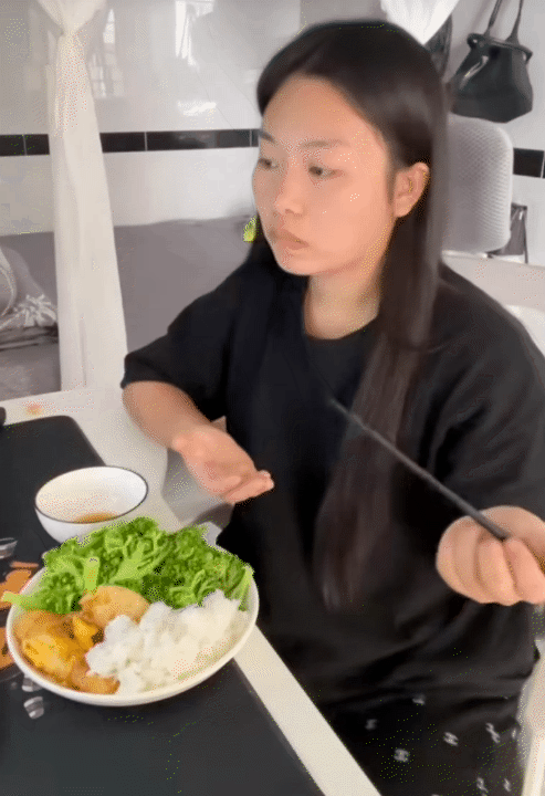 Có lần khác, cô chia sẻ bữa cơm trưa khoảng 18k với thịt luộc và đỗ luộc chấm mắm tỏi. "Bữa trưa 18k của mình thì có thịt luộc 55k, mình chia làm mấy bữa. Bữa trưa hôm nay thì mình luộc một ít thịt để ăn chấm mắm tỏi. Đỗ thì được bà ngoại cho từ trước nên mình nhặt và luộc lên. Vậy là đã có bữa trưa 18k với thịt luộc, đỗ luộc chấm mắm tỏi thơm ngon rồi".