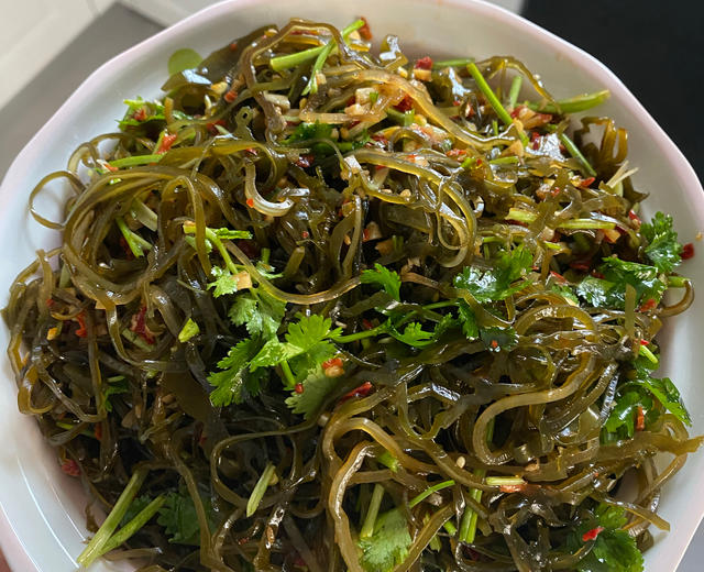 Nguyên liệu: 1 dải tảo bẹ khô (hoặc tươi), 5 tép tỏi băm, 1 quả ớt, 1 muỗng canh nước mắm, 1/2 muỗng canh giấm balsamic, đường, một chút dầu mè, một ít hạt mè trắng rang, rau mùi thái nhỏ.