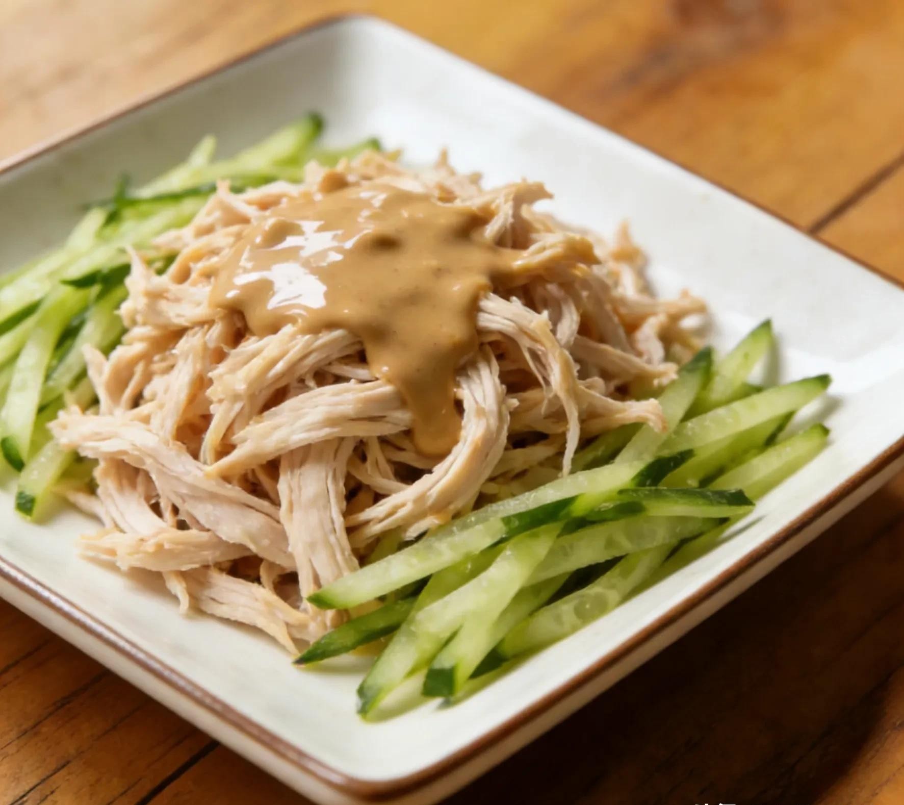 Nguyên liệu: 1 miếng thịt ức gà, vài lát gừng, hành lá, rượu nấu ăn, 2 quả dưa chuột, 3 tép tỏi băm, 1 quả ớt băm (tuỳ thích), 2 muỗng canh nước nước mắm, 1 muỗng canh giấm balsamic, đường, rau mùi thái nhỏ.