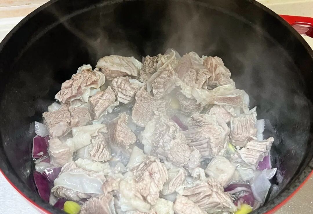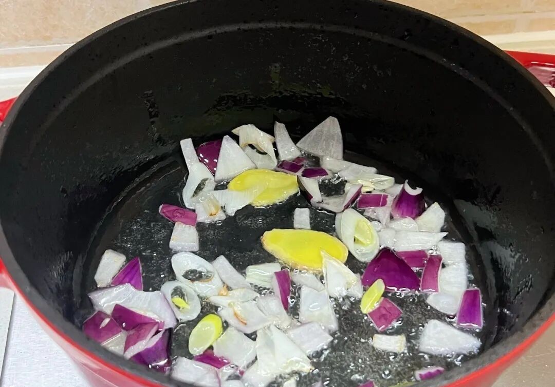 Bước 3: Làm nóng nồi gang (hoặc nồi áp suất) trên lửa, cho dầu ăn vào. Khi dầu nóng thì thêm gốc hành lá, gừng thái lát và hành tây thái miếng nhỏ vào, xào cho đến khi dậy mùi thơm. Tiếp đó bạn cho các miếng thịt ức bò vào nồi và xào khoảng 2 phút.