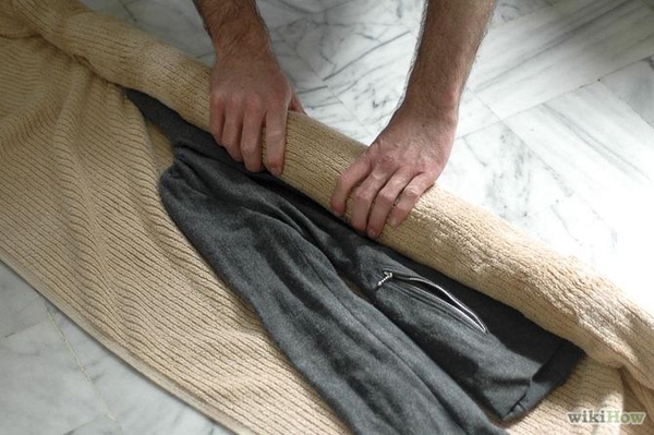 Bước 5.Trải phẳng áo lên một tấm khăn tắm lớn. Cuộn áo trong khăn. Giữ nguyên vài phút để cho chúng hút sạch nước thừa.