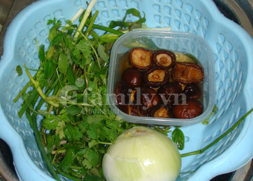 Nấm hương rửa qua nước rồi ngâm nở, rửa sạch, bỏ chân, thái chỉ. Nước ngâm nấm bạn chắt bỏ cặn rồi giữ lại nhé.