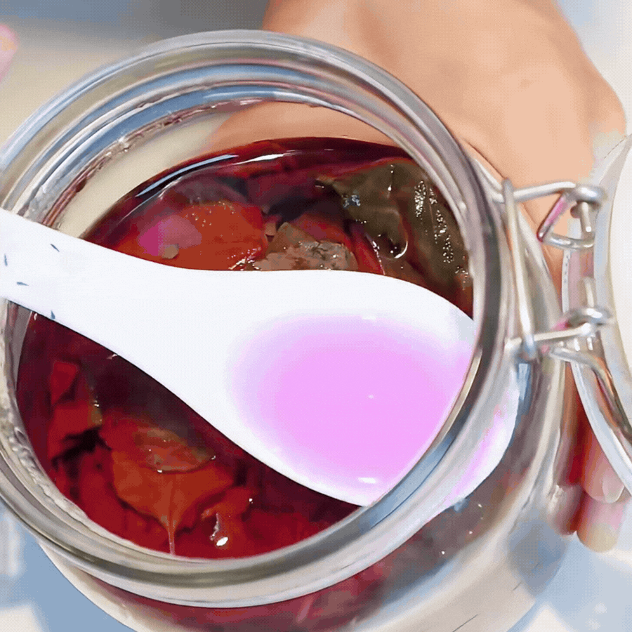 Nếu bạn thuộc team yêu cái đẹp và sự lãng mạn, hãy chọn tía tô đỏ. Những chiếc lá nhuốm màu thời gian ấy sẽ từ từ phai ra, nhuộm cả hũ giấm gạo trong veo thành một màu hồng tím sóng sánh, mộng mơ và ngọt ngào đến lịm tim.