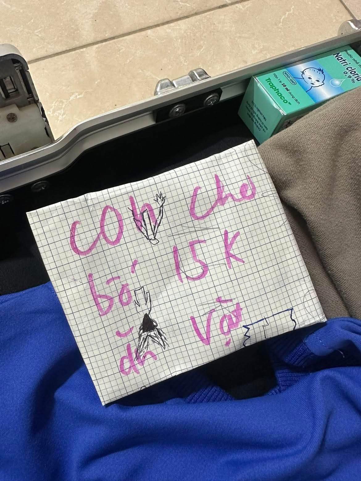 Trong ảnh, tờ giấy ô ly được tô chữ màu hồng nổi bật, kèm hình vẽ ngộ nghĩnh của một đứa trẻ. Số tiền 15.000 đồng không phải con số lớn nhưng lại trở thành chi tiết khiến nhiều người xúc động.