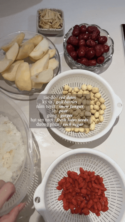 - Táo đỏ, kỷ tử, nấm tuyết, lê, gừng, hạt sen tươi, đường phèn (định lượng phụ thuộc vào số người ăn).