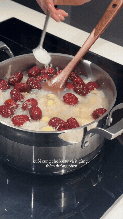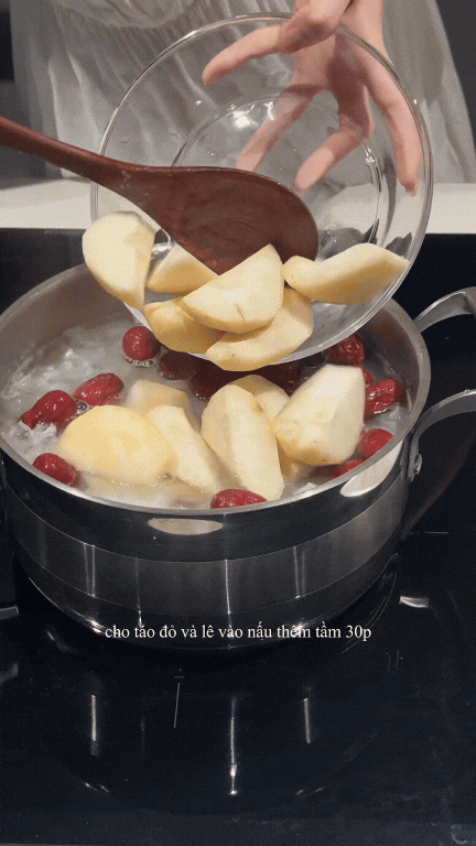 Cho táo đỏ và lê vào nấu thêm tầm 25-30 phút nữa. Táo đỏ bạn có thể bổ đôi, tách hạt hoặc giữ nguyên tùy thích. Cuối cùng, cho ít gừng, đường phèn và kỷ tử vào. Khuấy đều và nấu thêm tầm 5 phút nữa.