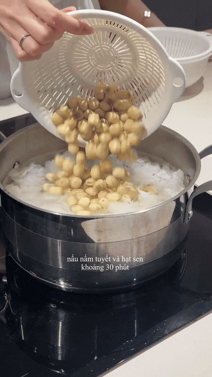 Bạn có thể dùng hạt sen khô, tuy nhiên, để tăng tính thơm ngon và tươi mới cho bát chè dưỡng nhan thì sử dụng hạt sen tươi sẽ hấp dẫn hơn. Hạt sen tươi sau khi bỏ tâm thì cho vào cùng nấm tuyết nấu khoảng 30 phút.