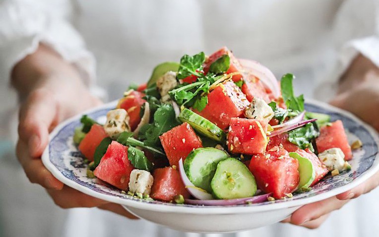Salad dưa hấu kiểu Địa Trung Hải: dưa hấu thái miếng kết hợp với dưa chuột, hành tím, rau rocket và phô mai Feta, trộn với sốt giấm balsamic dầu ô liu nước cốt chanh để có món ăn tươi mát, dễ ăn và giàu vitamin.