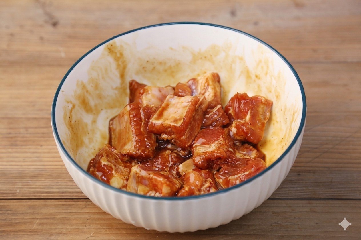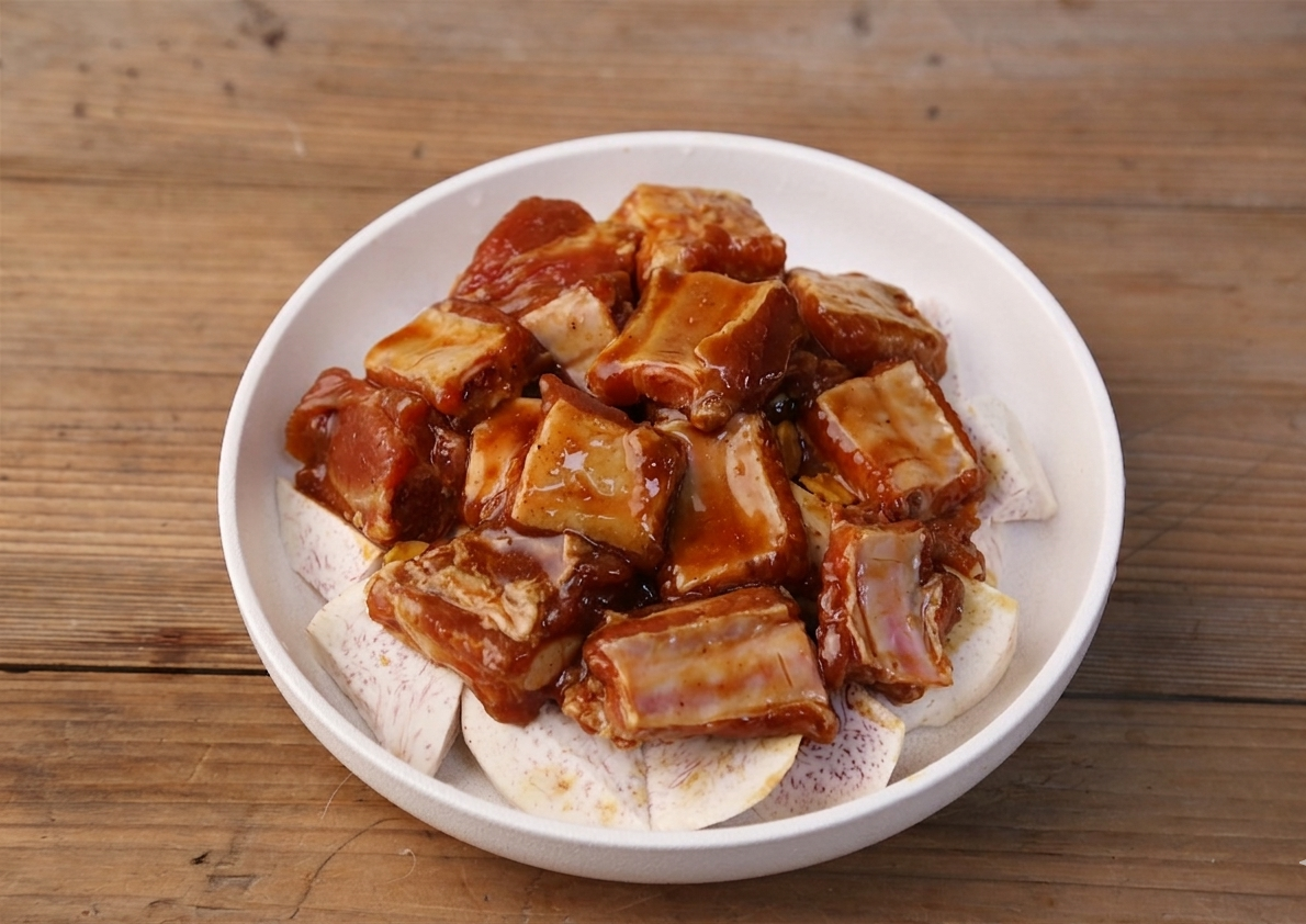1 củ khoai môn, 450g sườn heo, 2 muỗng canh nước tương, 2 muỗng canh dầu hào, 1 muỗng cà phê bột ngũ vị hương, 1 muỗng cà phê bột nêm gà, một nhúm muối, 1/2 muỗng cà phê đường, 1 muỗng canh rượu gạo, 2 lát gừng.