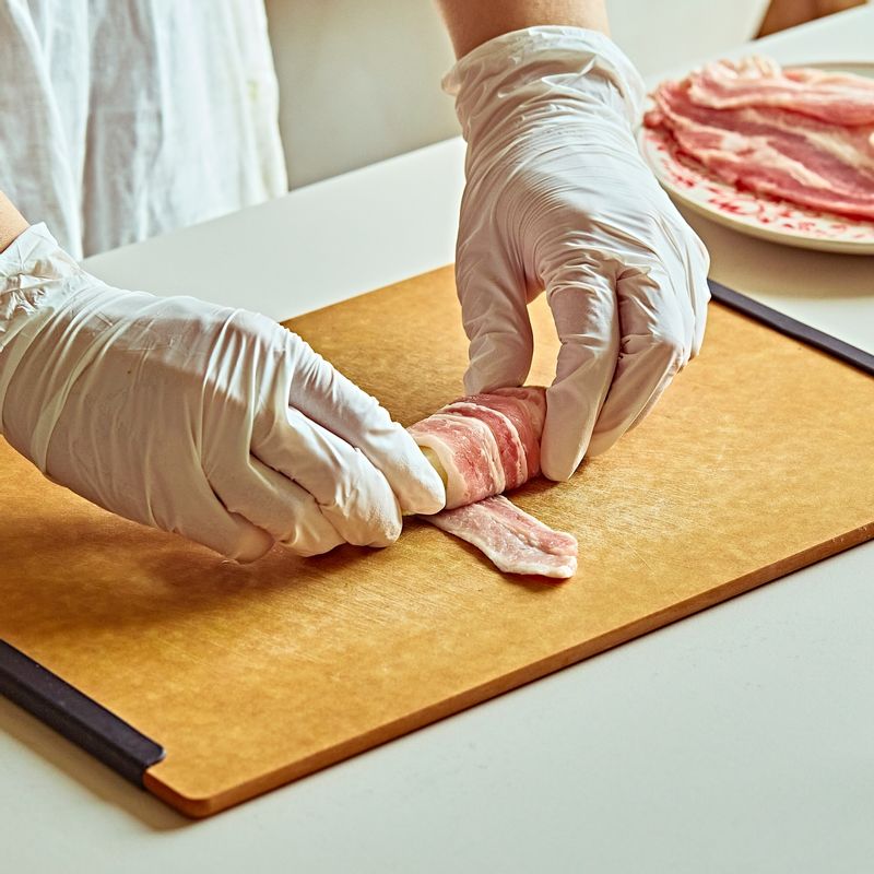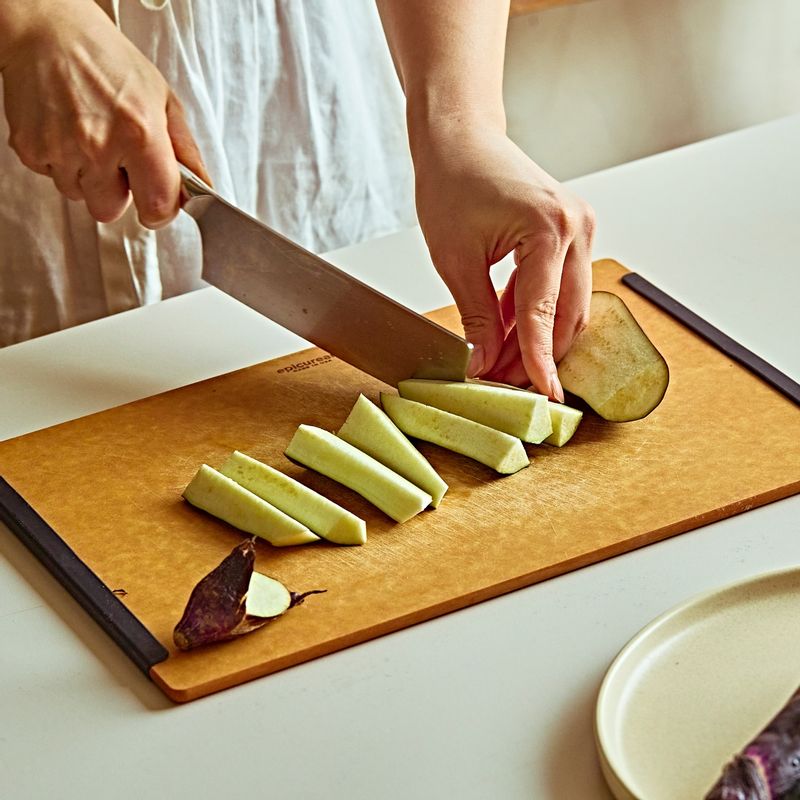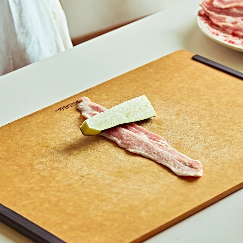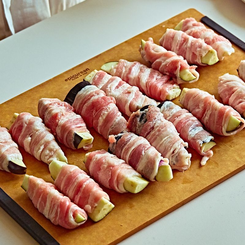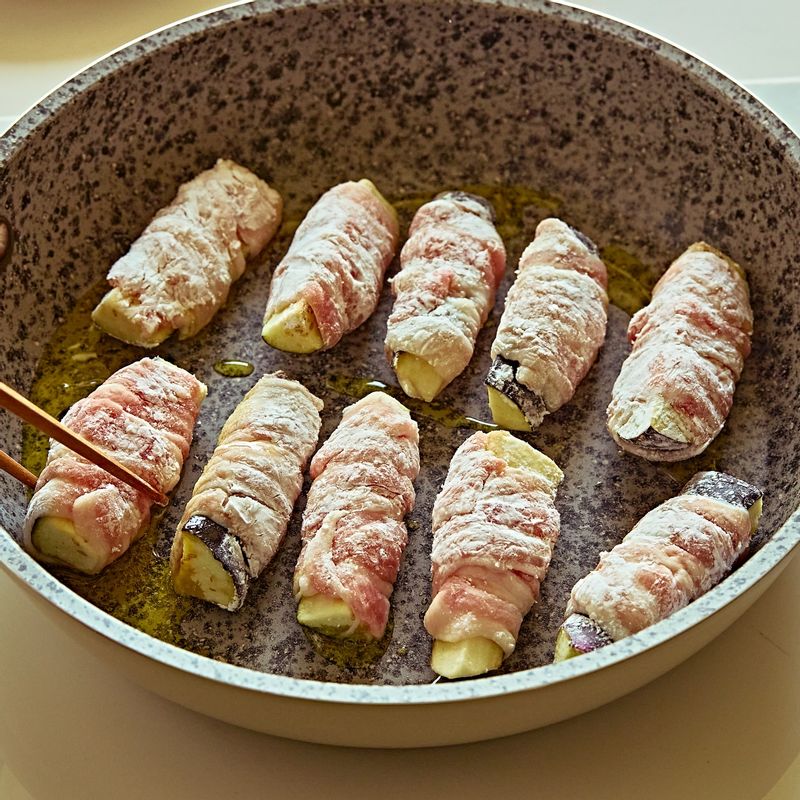 Bước 1: Cà tím bạn cắt bỏ cuống sau đó rửa sạch rồi ngâm trong nước muối pha loãng khoảng 15 phút để loại bỏ tạp chất. Tiếp theo bạn cắt cà tím thành dạng hình que. Bạn có thể ngâm qua cà tím đã cắt trong nước muối pha loãng để tránh quá trình oxy hóa, chuyển màu đen. Tiếp theo bạn dùng từng lát thịt ba chỉ heo (hoặc bò) cuộn từng miếng cà tím lại. Lá tía tô rửa sạch, thái nhỏ.