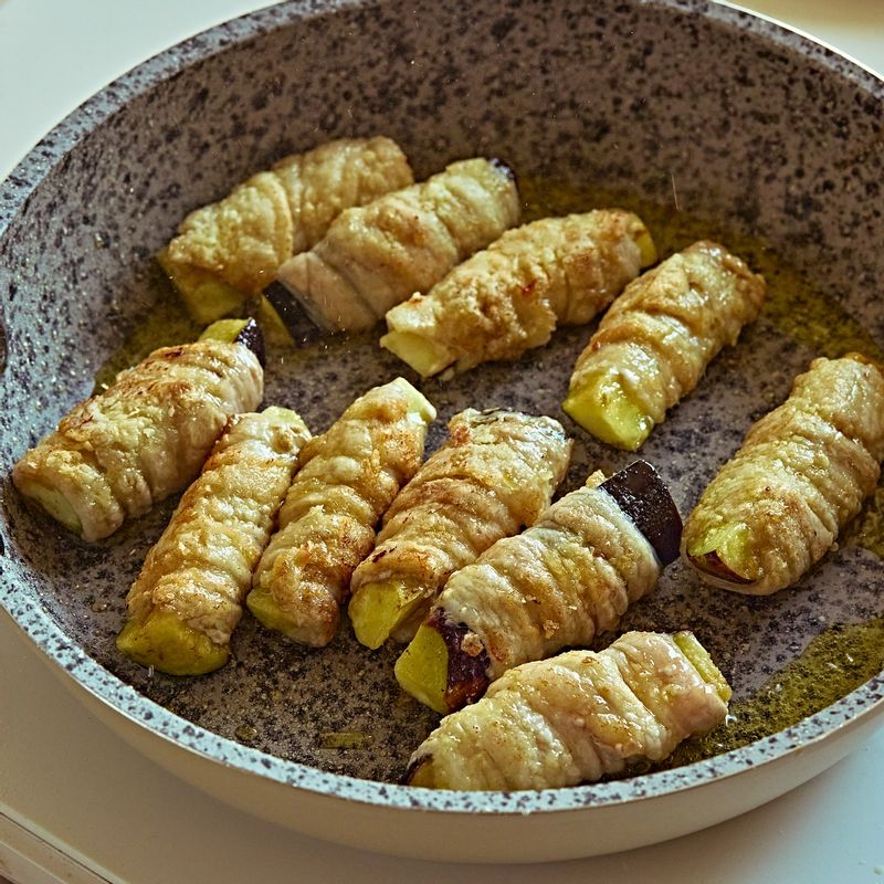 Chả giò cà tím cuộn thịt heo là một món ăn độc đáo, kết hợp giữa vị mềm ẩm của cà tím và hương vị thơm ngon của thịt heo. Thịt heo thái mỏng được cuộn trong cà tím, phủ một lớp bột và rưới nước tương ngọt mặn, tạo nên lớp vỏ ngoài vàng nâu, bên trong mềm ẩm. Đây là một lựa chọn tuyệt vời cho bữa cơm nhà trong tiết trời mùa thu se lạnh.
