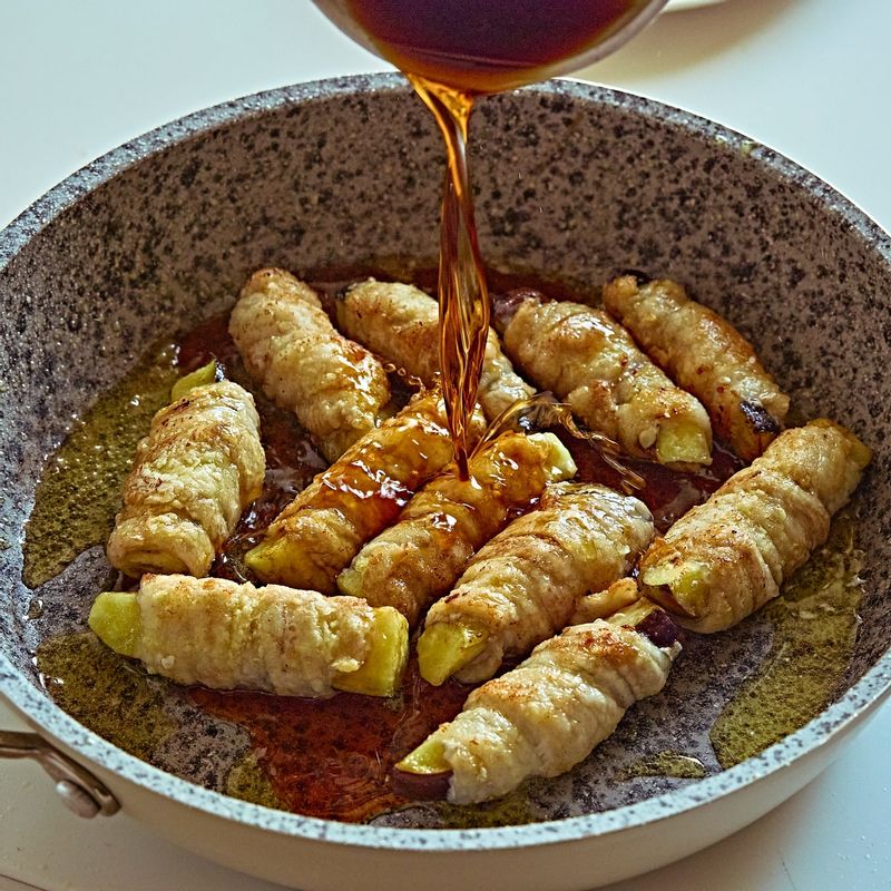 Bước 3: Bạn chuẩn bị một chiếc bát, sau đó cho nước tương, rượu mirin, rượu gạo, đường vào. Dùng thìa khuấy đều cho đế khi các nguyên liệu gia vị hòa quyện thành hỗn hợp nước sốt. Tiếp theo bạn đặt chảo lên bếp, cho một chút dầu ăn vào rồi đun nóng. Sau khi dầu nóng thì cho từng phần cà tím đã được cuộn thịt ba chỉ vào, chiên đế khi có màu vàng nâu. Rưới nước sốt lên trên, lật mặt và tiếp tục nấu thêm một lúc để từng phần chả giò phủ đều và ngấm nước sốt. Sau đó bạn lấy ra đĩa, rắc lá tía tô thái nhỏ và hạt vừng rang lên trên rồi thưởng thức.