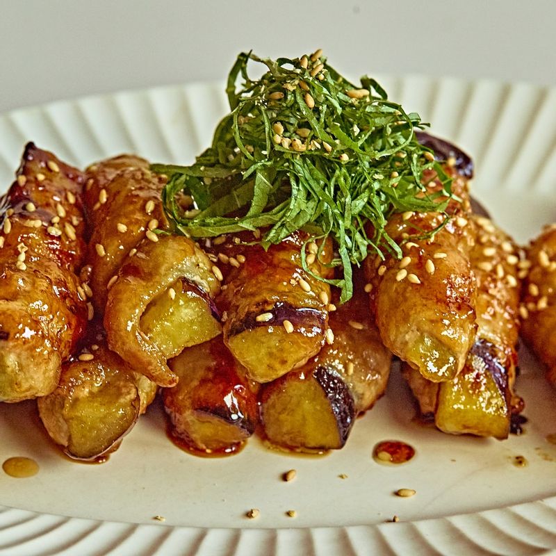 2 quả cà tím, 200g thịt ba chỉ thái lát mỏng (có thể dùng thịt bò hoặc thịt heo hay nhúng lẩu), 3 thìa canh tinh bột, 3 thìa canh dầu ăn, một ít lá tía tô, một hạt vừng trắng, 1 thìa canh nước tương, 1 thìa canh rượu mirin, 1 thìa canh rượu gạo, 1/2 thìa canh đường.