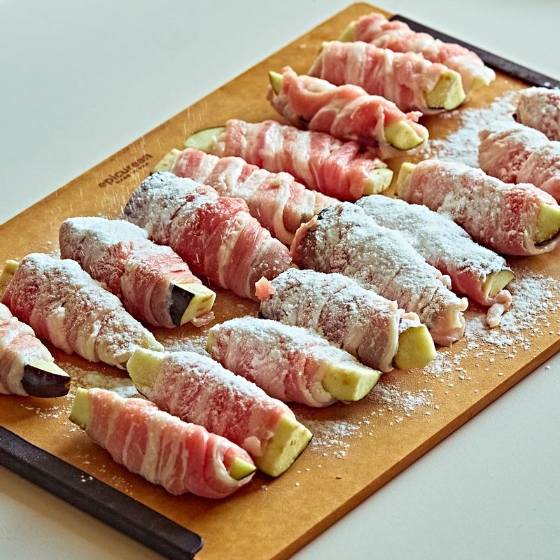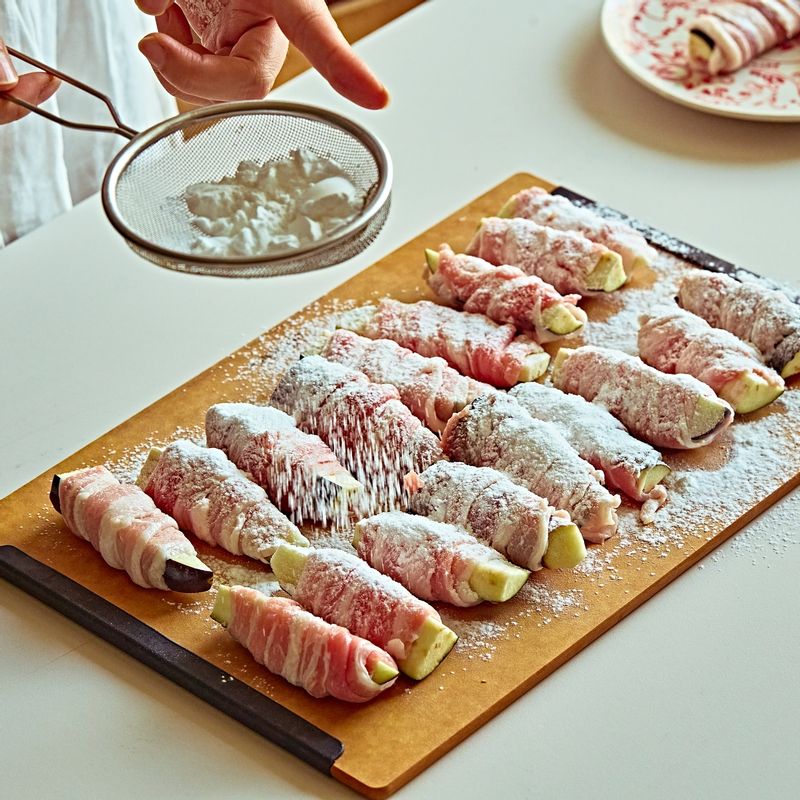 Bước 2: Sau khi cuộn hết các nguyên liệu, bạn xếp toàn bộ lên mặt thớt. Cho 3 thìa canh tinh bột (bột mì hoặc bột chiên giòn không chứa muối) vào rây rồi rắc đều lên từng phần cà tím đã được cuộn thịt heo.
