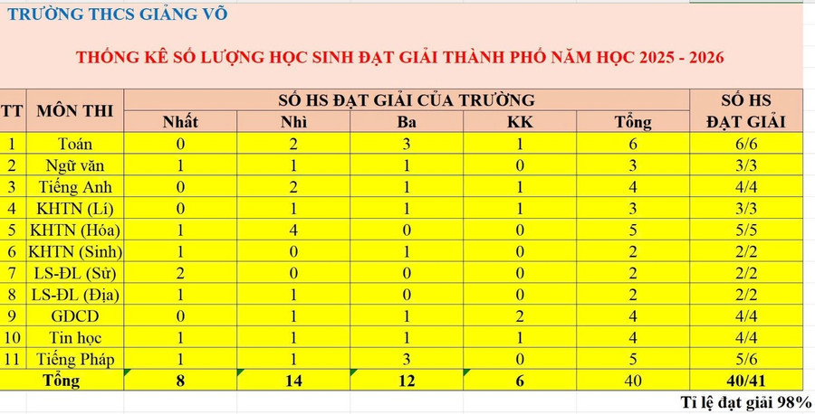 11 học sinh đã xuất sắc giành giải Nhất. Trong đó có 8 giải Nhất của Trường THCS Giảng Võ (Trần Ngân Khánh, lớp 9A2, môn Ngữ Văn; Nguyễn Phương Nguyên, lớp 9P, môn tiếng Pháp; Nguyễn Việt Bách, lớp 9A2, môn Tin học; Nguyễn Đăng Khoa, lớp 9A2, môn KHTN; Hoàng Thị Hoài An, lớp 9A2, Môn KHTN; Đinh Ngọc Diệp, lớp 9A1, môn Lịch sử; Trịnh Ánh Nhi, lớp 8P, môn Lịch sử và Nguyễn Đức Khang, lớp 9A7, môn Địa lí).