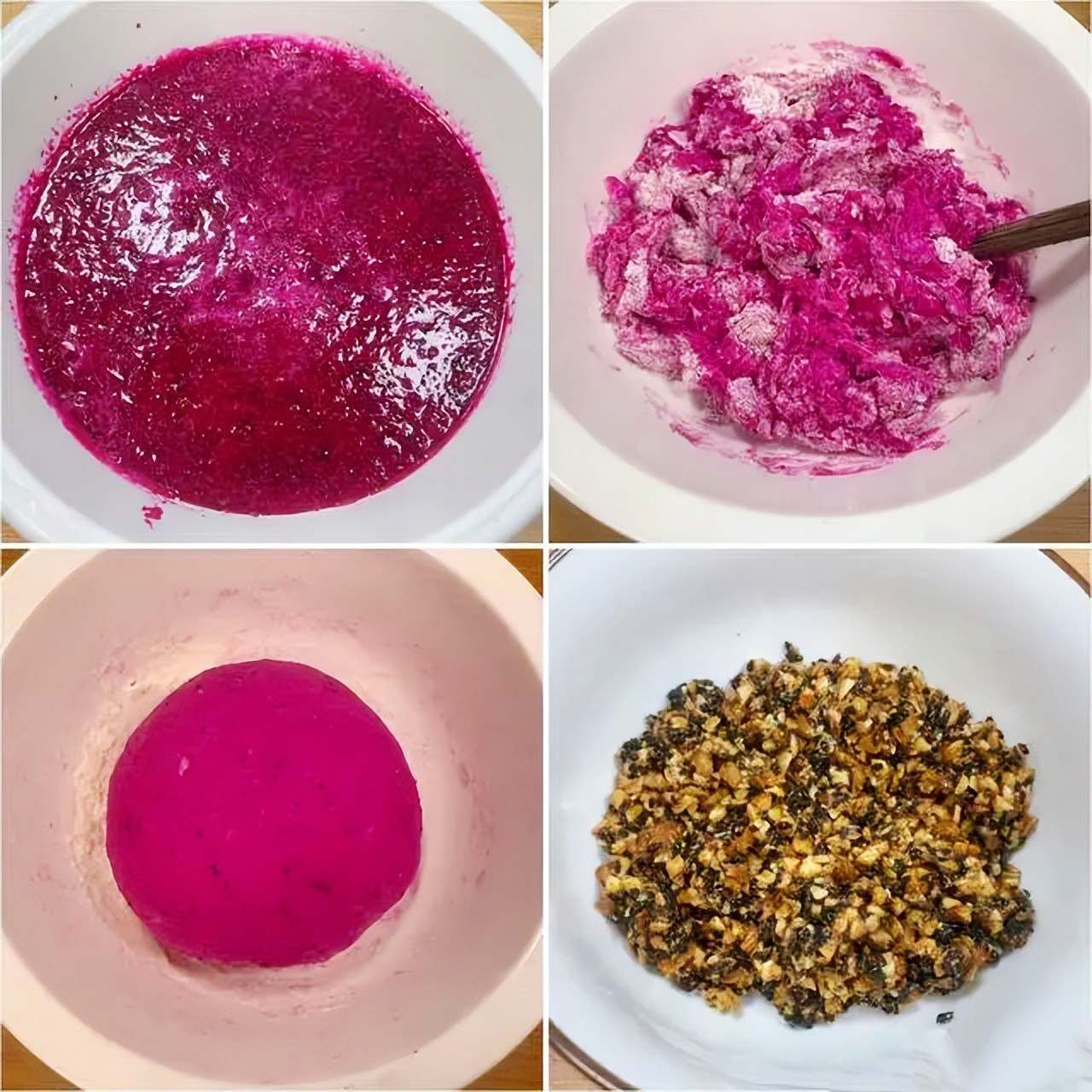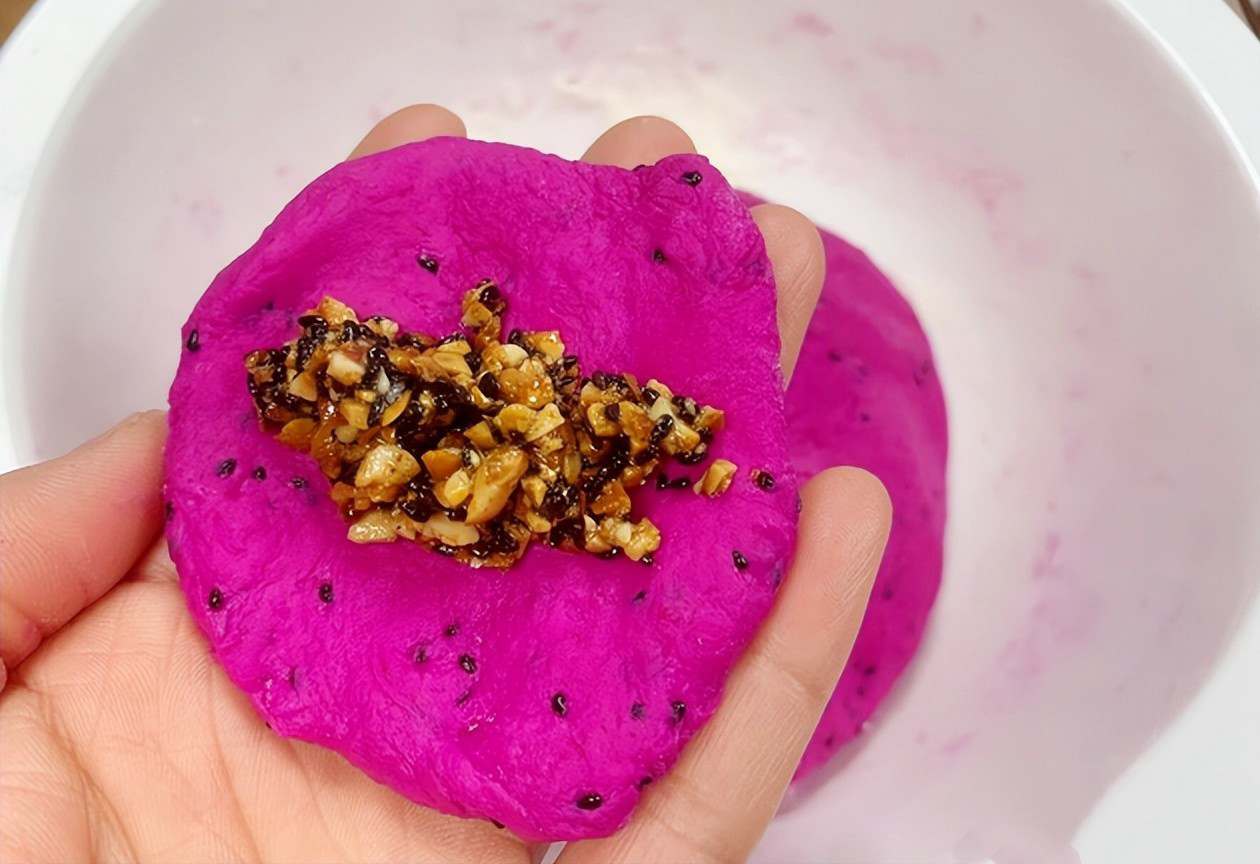Chỉ cần vài nguyên liệu bình dân là có ngay món bánh xinh như viên ngọc nhỏ: Thanh long ruột đỏ, bột mì, vừng đen và lạc rang. Nhưng khi kết hợp lại, chúng tạo nên một món ăn đẹp mắt, giàu dinh dưỡng và rất hợp tiết trời khô hanh cuối năm.