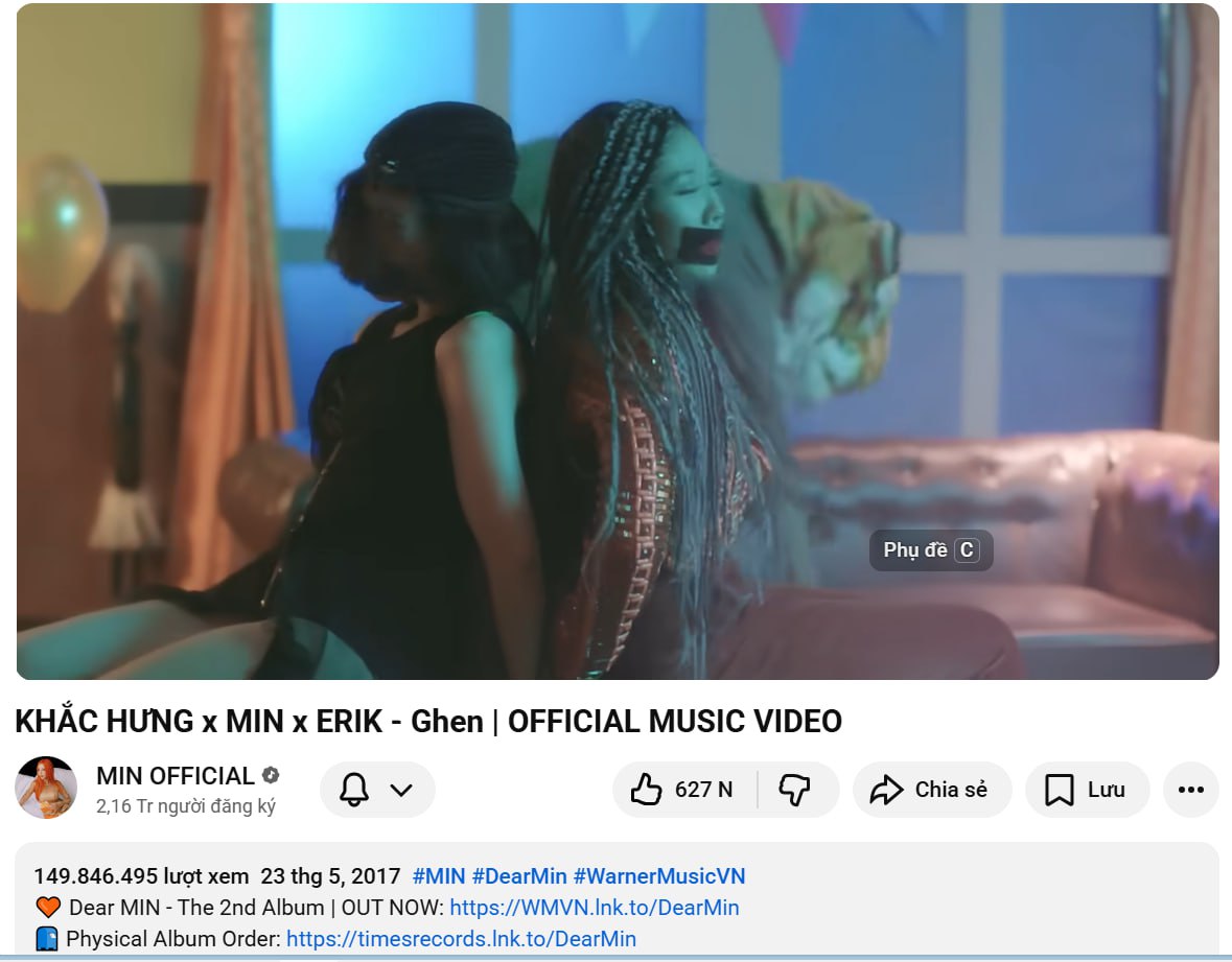 Danh sách "câu lạc bộ trăm triệu view" của cô bao gồm những cái tên đình đám như: Ghen (kết hợp cùng Erik), Đừng Yêu Nữa Em Mệt Rồi , Ghen Cô Vy , Bài Này Chill Phết (kết hợp cùng Đen Vâu), Trên Tình Bạn Dưới Tình Yêu và Có Em Chờ . Đặc biệt, vào năm 2022, khi MV Có Em Chờ chính thức cán mốc 100 triệu lượt xem trên YouTube, Min đã chính thức xác lập kỷ lục là nữ nghệ sĩ có nhiều MV đạt thành tích này nhất showbiz Việt. Chuỗi thành tích này là minh chứng rõ ràng nhất cho sức hút bền bỉ và khả năng "chạm" đến thị hiếu khán giả đại chúng của Min.