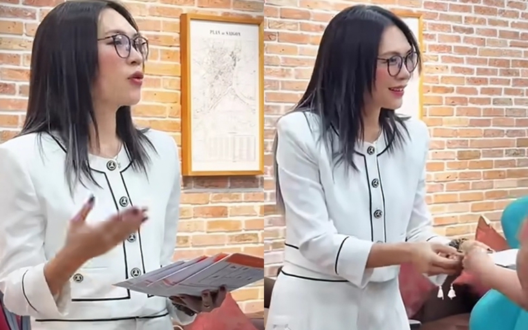Mỹ Tâm cầm xấp phong bì tiền mặt, cúi đầu trước nhân viên lớn tuổi