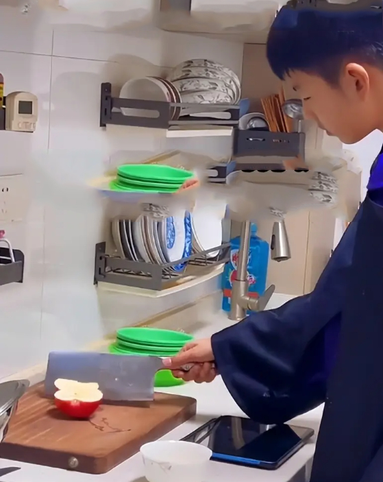 Điều đáng nói là khi chứng kiến cảnh tượng đó, người mẹ không hề bước tới hướng dẫn con cách cầm dao sao cho đúng. Chị chỉ đứng bên cạnh và không ngớt lời xuýt xoa: "Ây da, con trai mẹ làm được rồi, giỏi quá!" .