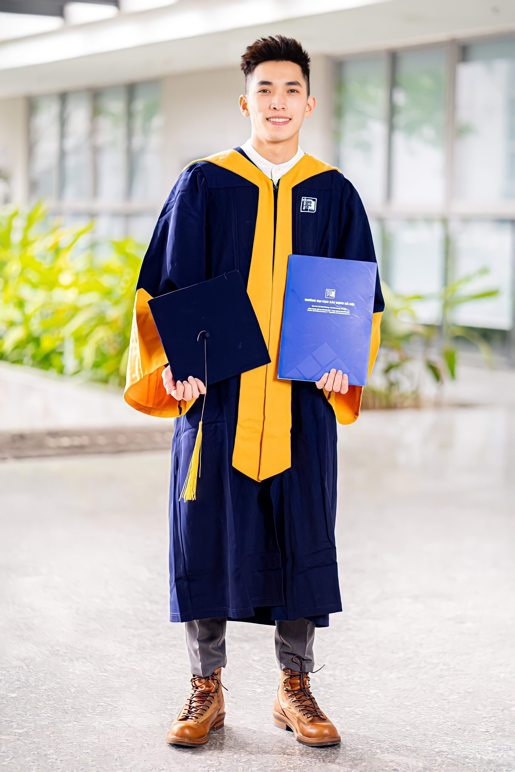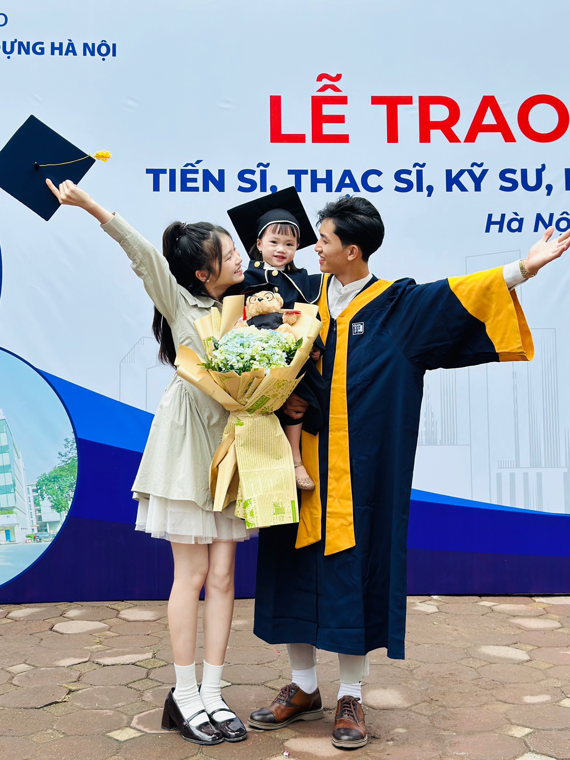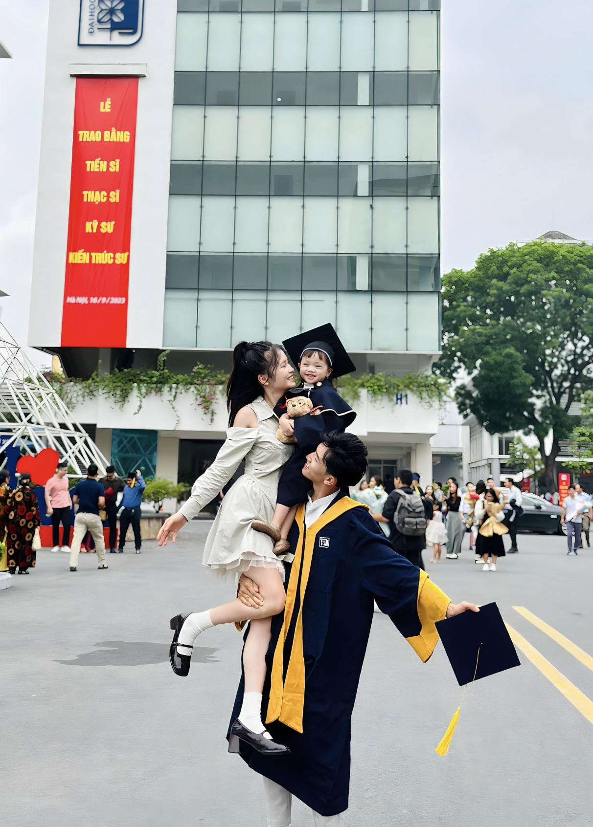 Nguyễn Hải Tú (2000) - người vừa tốt nghiệp chuyên ngành Kỹ thuật Xây dựng (Đại học Xây dựng Hà Nội) mới đây đã có một lễ tốt nghiệp đáng nhớ như vậy. Hình ảnh Hải Tú bế cả vợ lẫn con gái trên vai trong buổi nhận bằng đại học được dân tình chia sẻ rầm rộ.