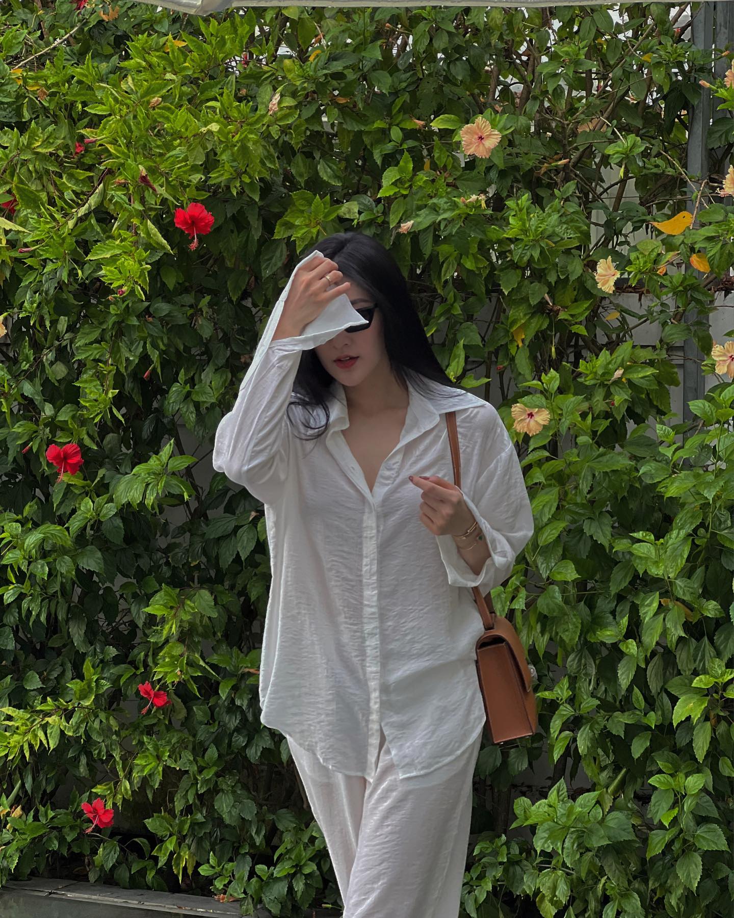 Sơ mi trắng là biểu tượng của sự thanh lịch và trong phong cách của mọi quý cô, và item này được Dương Tú Anh khai thác triệt để. Công thức cơ bản nhất là sơ mi trắng kết hợp quần ống suông cùng tông. Set đồ tưởng chừng đơn giản nhưng lại toát lên thần thái sang trọng nhờ phom dáng gọn gàng, chất liệu tốt và cách giữ mọi thứ tinh tế.