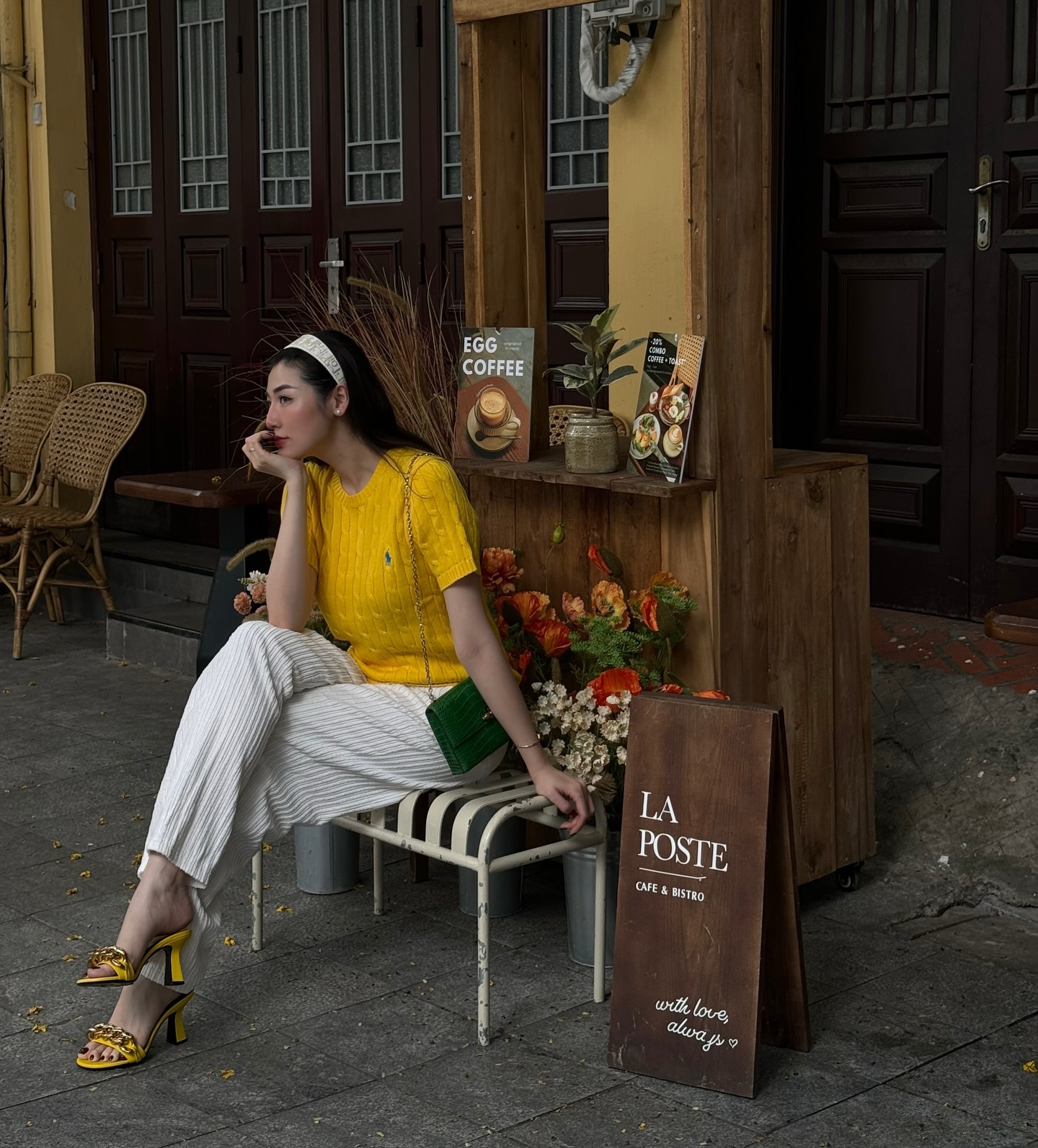 Về giày dép, sandal cao gót dáng mule là lựa chọn quen thuộc. Thiết kế hở gót tạo cảm giác nhẹ nhàng, hiện đại mà vẫn đủ thanh lịch. Ngoài ra, giày búp bê trắng cũng được ưu ái khi cần sự mềm mại. Điểm chung là kiểu dáng đơn giản, không quá nhiều chi tiết rườm rà, giúp giữ trọn tinh thần tinh giản, hài hòa.